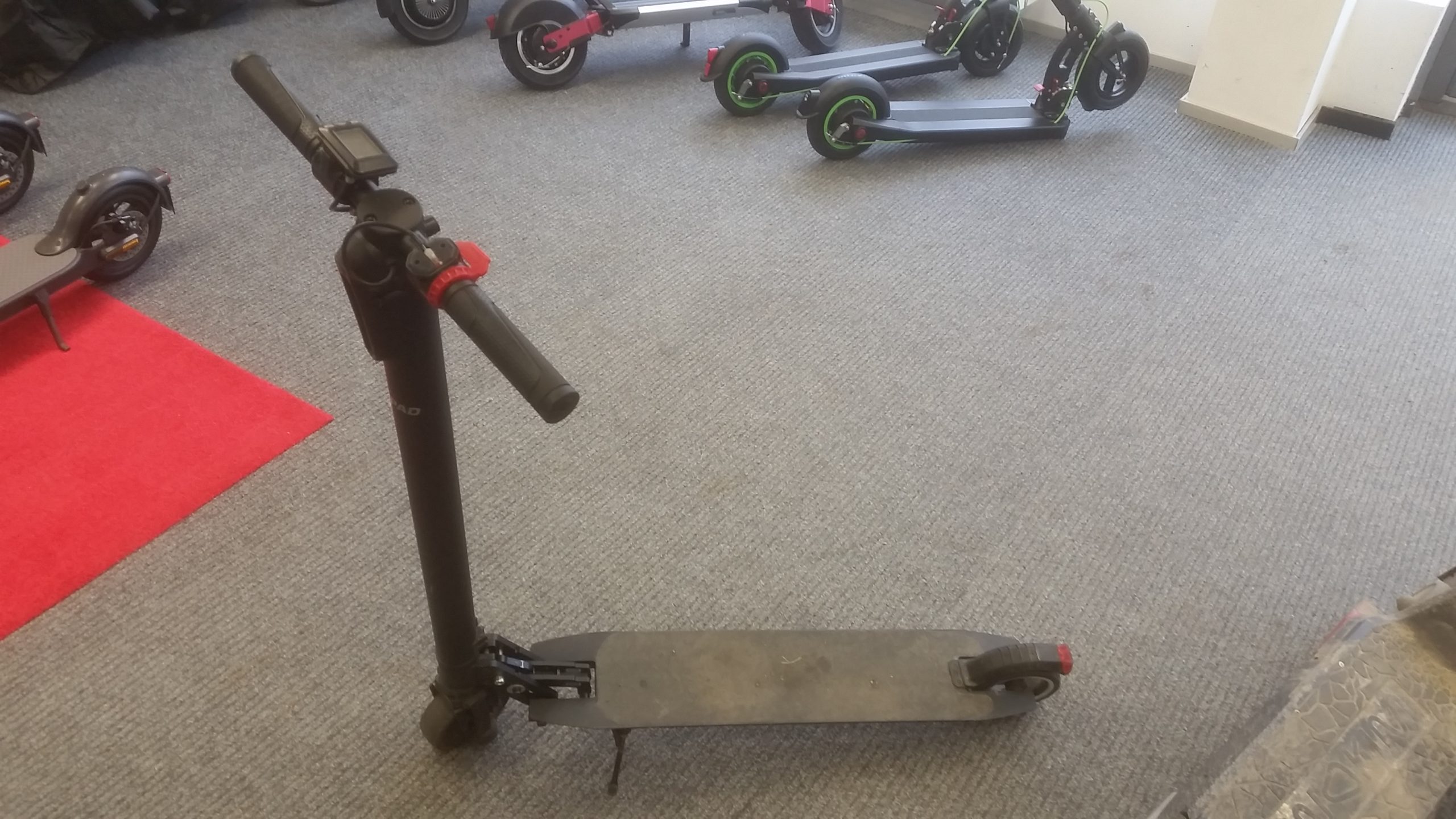 Kasutatud elektritõukeratas Gpad Lite 5KC / Carbon. Kokku murdmise mehhanism on jäädavalt fikseeritud poldiga ning elektritõukeratas ei ole kokku murtav. Samuti ei ole kokku murdmise konstruktsioonis loksu. Esirehvil on kulumisjäljed, piduripedaali kate on puudu.